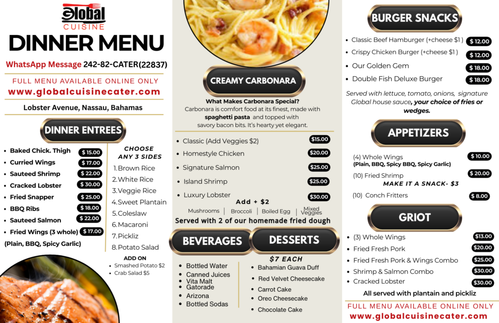 Orders for Global Cuisine Cater can be placed through the website or WhatsApp message (242) 429-7111.